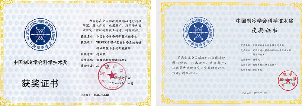 “NH3/CO2螺桿復(fù)疊制冷系統(tǒng)關(guān)鍵技術(shù)研究與系統(tǒng)開發(fā)應(yīng)用”獲山東省科技進(jìn)步一等獎和中國制冷學(xué)會科技進(jìn)步特等獎。
