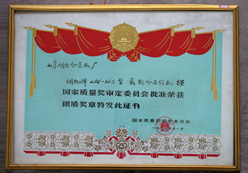 1988年11月,煙機(jī)牌4AV-12.5型氨制冷壓縮機(jī)獲國家質(zhì)量銀質(zhì)獎?wù)隆?/p>